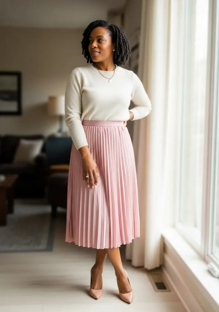 This outfit combines a pink pleated midi skirt with a soft sweater and neutral heels. The pleats add movement, while the sweater keeps the look cozy and relaxed. The colors feel calm and elegant.