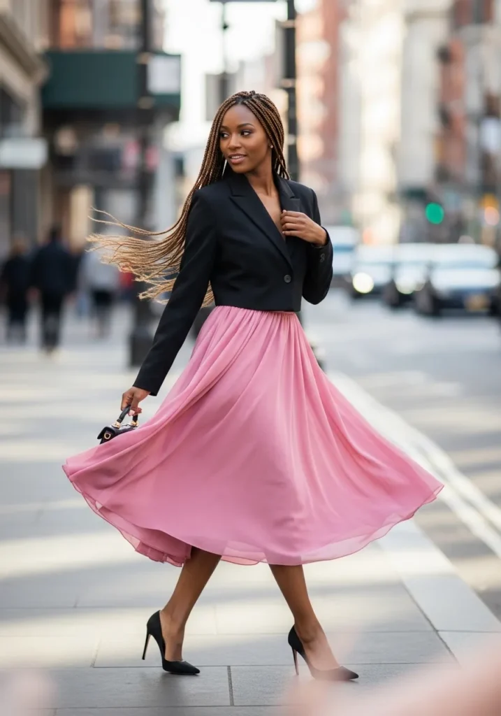 This look showcases a flowing pink skirt styled with a fitted dark top and heels. The contrast highlights the skirt and creates a flattering silhouette. The movement of the fabric adds drama without feeling too much.