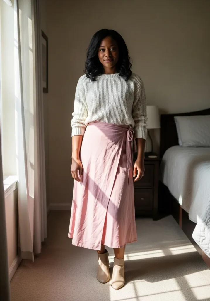 This outfit combines a soft pink midi skirt with a light knit sweater and neutral shoes. The textures work beautifully together, creating a cozy but refined silhouette. The look feels calm and wearable.