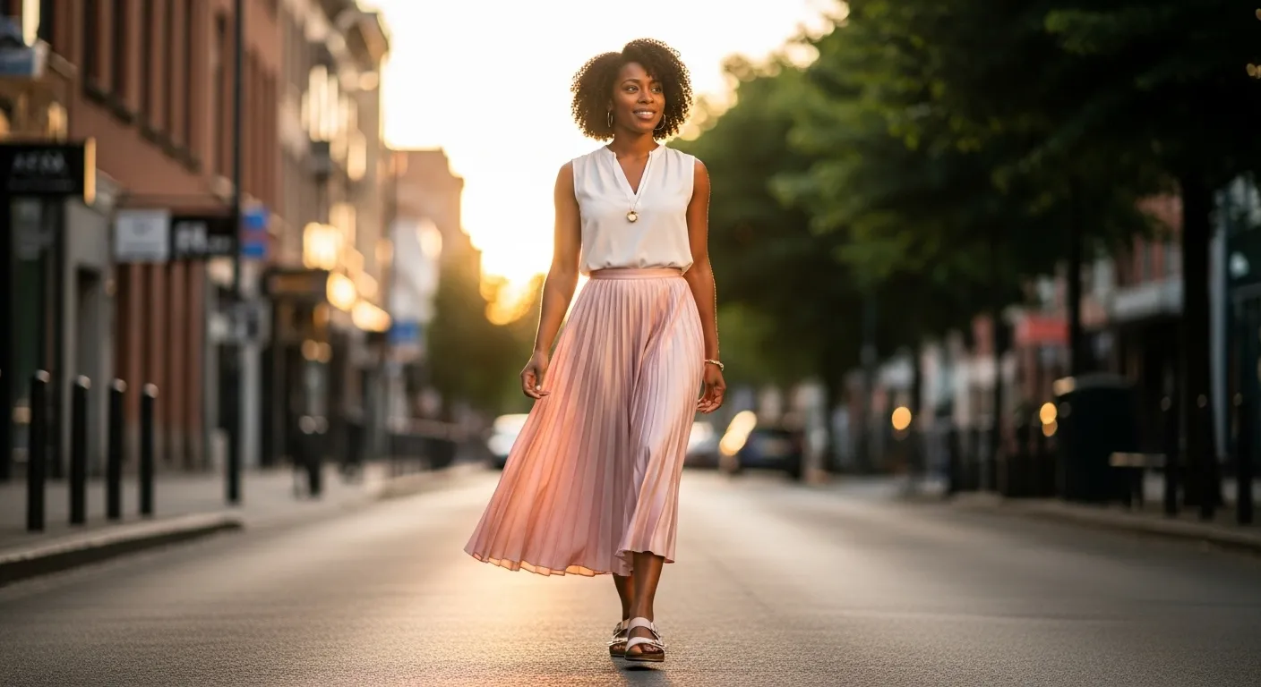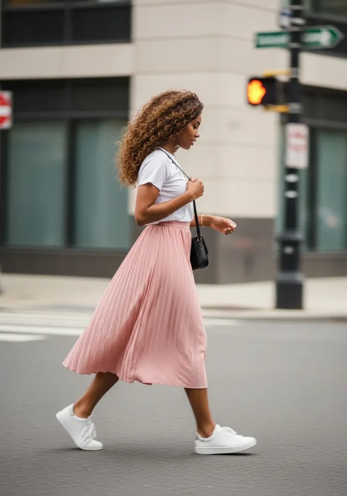 This look combines a soft pink midi skirt with a relaxed tee and clean sneakers. The contrast between feminine and casual makes the outfit feel modern and easy. It is light, comfortable, and practical.