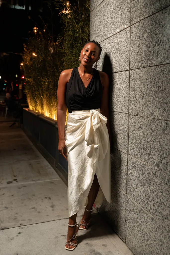 This outfit pairs a silky ivory wrap skirt with a sleek black sleeveless top for a balanced and polished look. The skirt adds softness and movement, while the top keeps everything clean and structured. Neutral heels finish the outfit effortlessly.