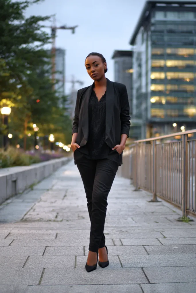 This look features a tailored black blazer paired with slim black trousers and a simple top underneath. The clean lines give it a sharp silhouette, while the styling keeps it approachable rather than corporate. Heels add just enough polish.