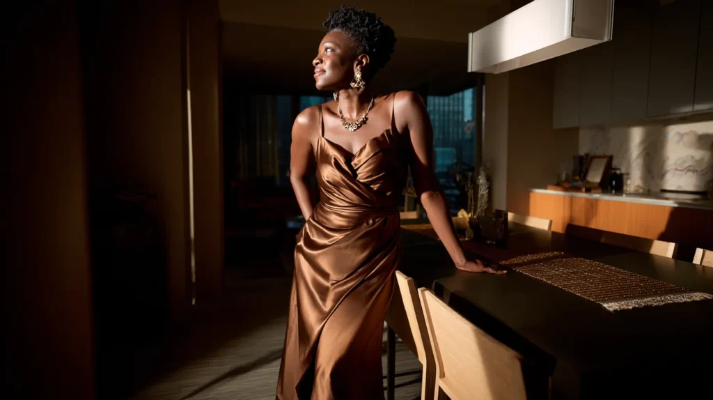 I love how this outfit proves that simple can still feel powerful. The satin fabric does all the work and gives that grown energy without trying too hard. It feels like the kind of dress you wear when you know exactly who you are and want your presence to speak before you even sit down at the table.