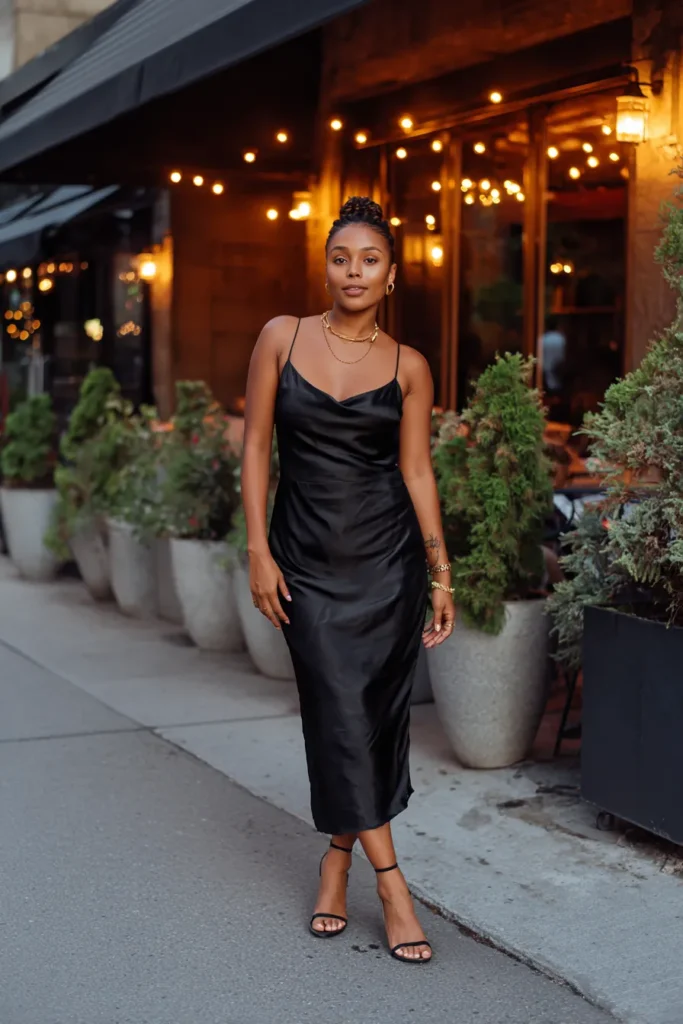 This look features a black satin slip dress with a soft sheen that catches the evening light just right. The silhouette is clean and fluid with thin straps and a subtle drape that hugs the body without feeling tight. Simple heels and minimal jewelry keep everything polished, while the overall vibe feels confident and effortlessly elegant for a birthday dinner setting.