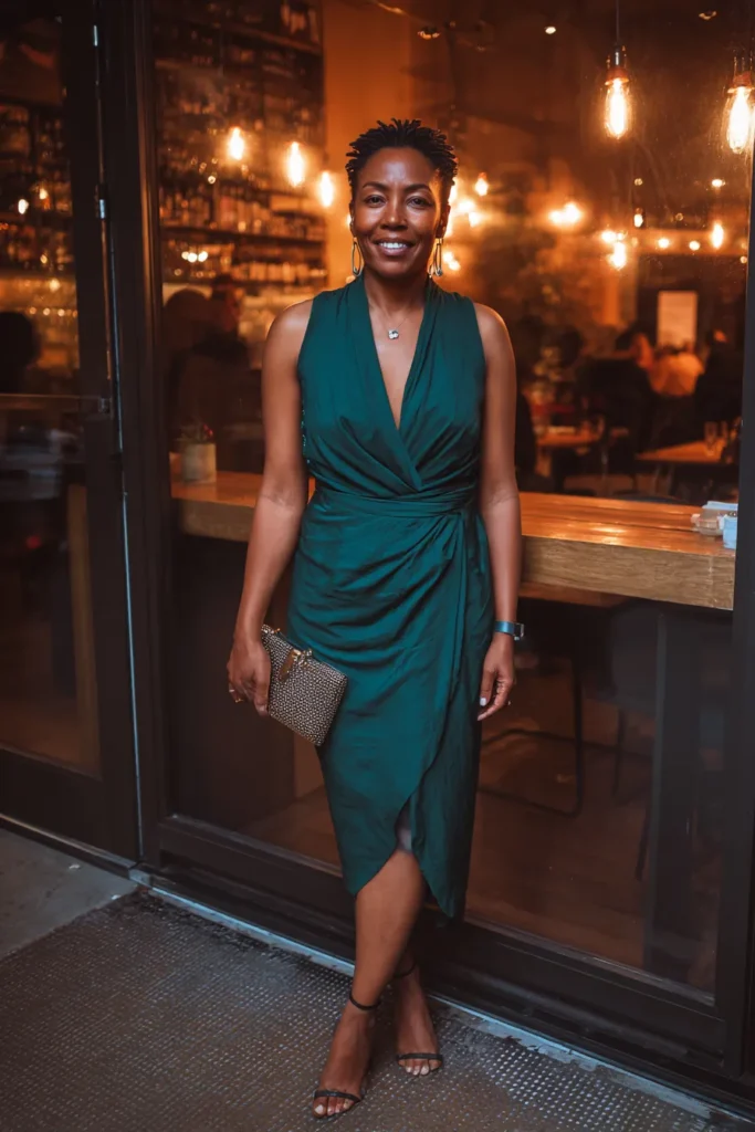 A rich emerald green wrap dress takes center stage here, featuring a deep V neckline and a softly draped skirt that moves beautifully when walking. The fabric looks smooth and slightly structured, offering shape while still feeling fluid. Paired with understated heels and a clutch, the look feels timeless and intentional.