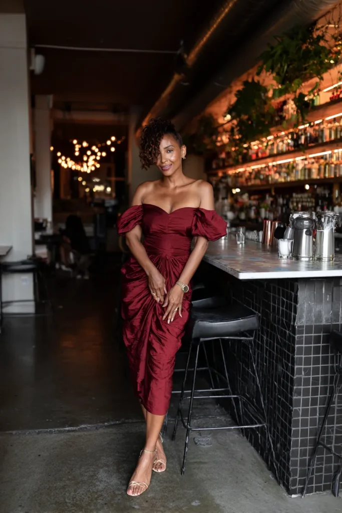 This outfit showcases a burgundy off shoulder dress with a fitted bodice and a softly textured fabric that adds depth. The neckline highlights the shoulders and collarbone while the rich color gives the entire look a luxe feel. Simple heels and a sleek hairstyle keep it feeling balanced and grown.