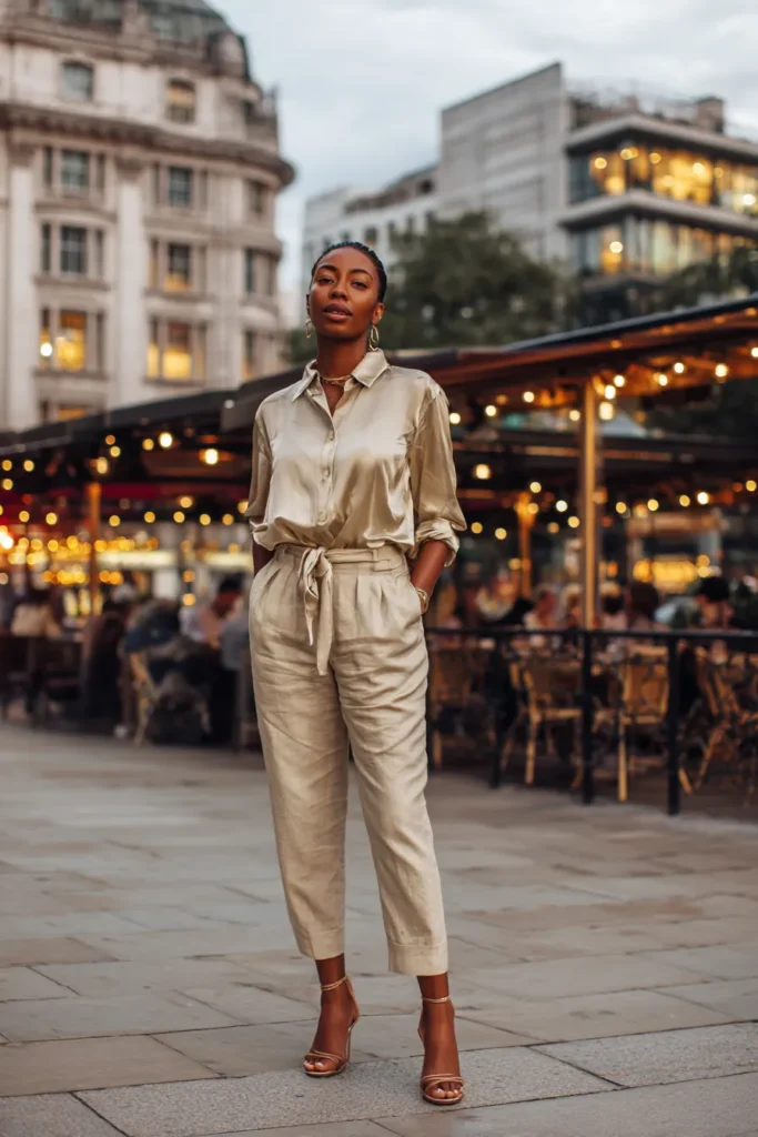This look features a matching neutral blouse and tailored trousers with a subtle sheen that elevates the entire outfit. The blouse drapes softly while the pants provide structure, creating a balanced and flattering shape. Minimal accessories and heels keep the focus on the clean lines and rich textures.