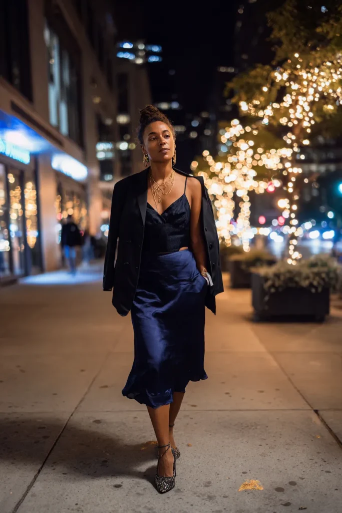 A navy satin midi dress with a gentle shine creates a refined evening look that feels timeless. The cut is sleek with delicate straps and a length that hits just right for an upscale dinner. Paired with simple heels, the outfit feels understated yet undeniably elegant.