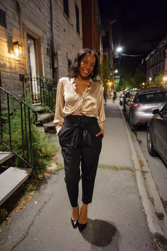 This outfit pairs a champagne toned satin blouse with tailored black trousers for a look that feels effortlessly sophisticated. The blouse adds softness and glow while the structured pants keep everything grounded and polished. Heels and a sleek bag complete the refined dinner ready vibe.
