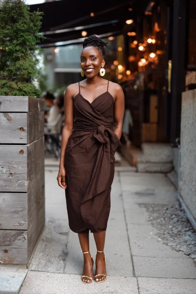 This look features a chocolate brown wrap dress with a gently draped silhouette that ties neatly at the waist. The fabric flows easily as she walks, creating natural movement without looking fussy. Paired with neutral heels and minimal accessories, the overall vibe feels warm, elegant, and quietly confident for a birthday dinner.