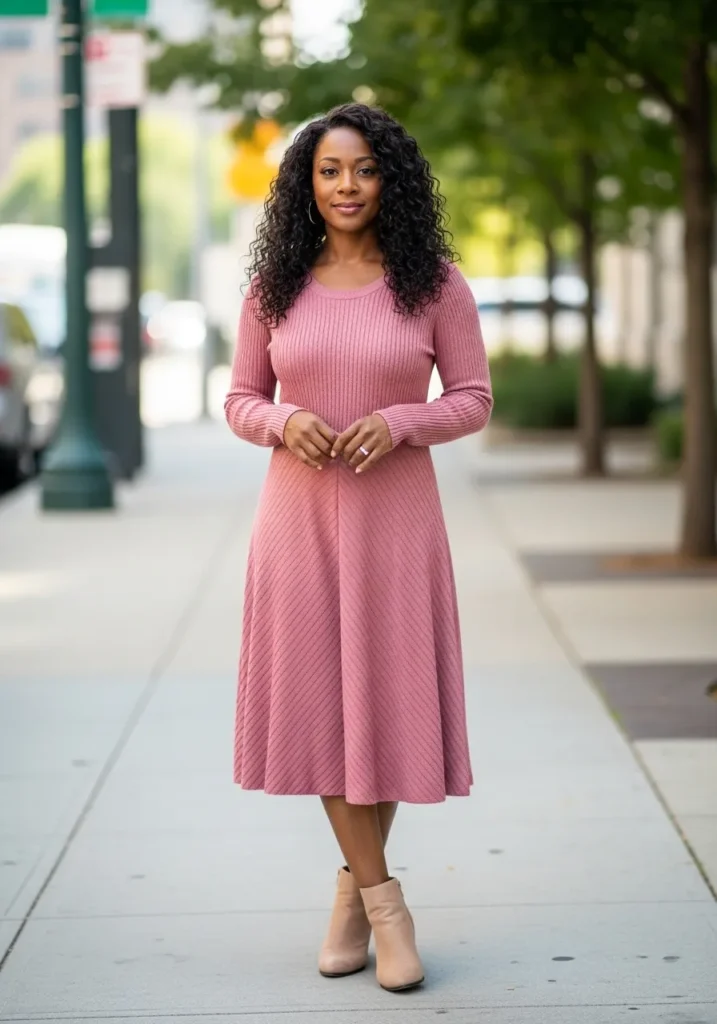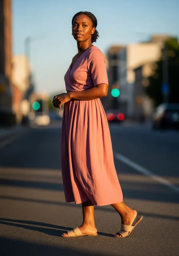 I am drawn to dresses like this because they never go out of style. The soft pink shade feels flattering and confident without trying too hard. This is the kind of outfit that makes me feel graceful and comfortable all day long.