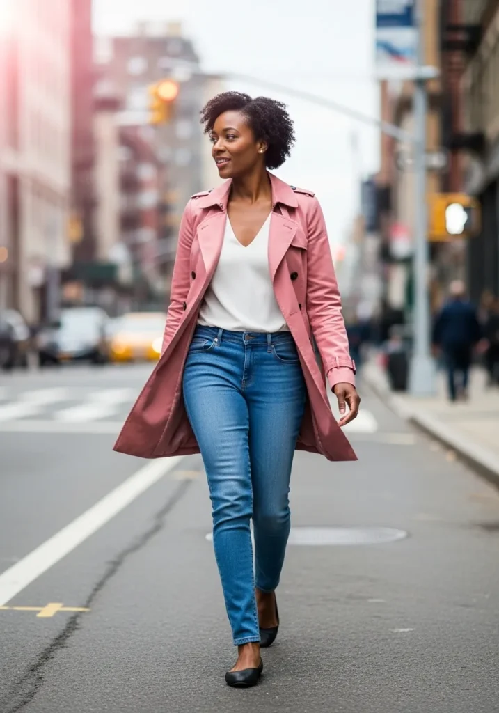 This look pairs a structured pink coat with a white top and classic blue jeans for a balanced everyday outfit. The coat adds shape and polish while the denim keeps things relaxed and practical. Neutral shoes finish the look in a clean and effortless way.