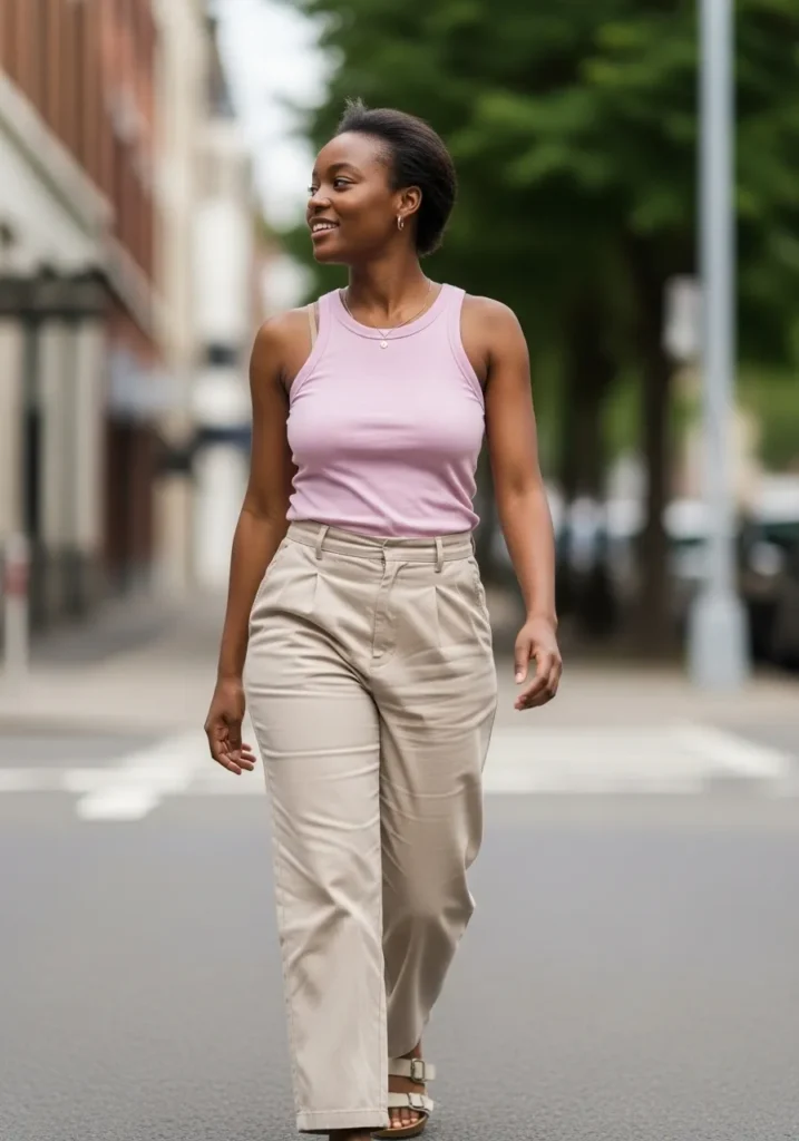 This outfit features a sleeveless pink top paired with high waisted beige trousers for a clean and modern vibe. The soft pink adds a gentle touch while the neutral pants keep the look grounded and versatile. The fit feels relaxed yet flattering.