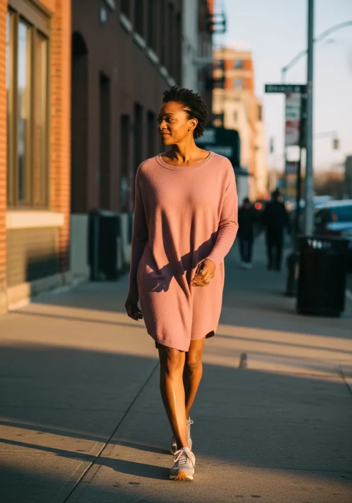 This look showcases a casual pink dress with a loose fit and soft fabric that moves easily. The length feels practical and the overall silhouette is relaxed and wearable. Simple sneakers keep the outfit grounded and perfect for daily activities.