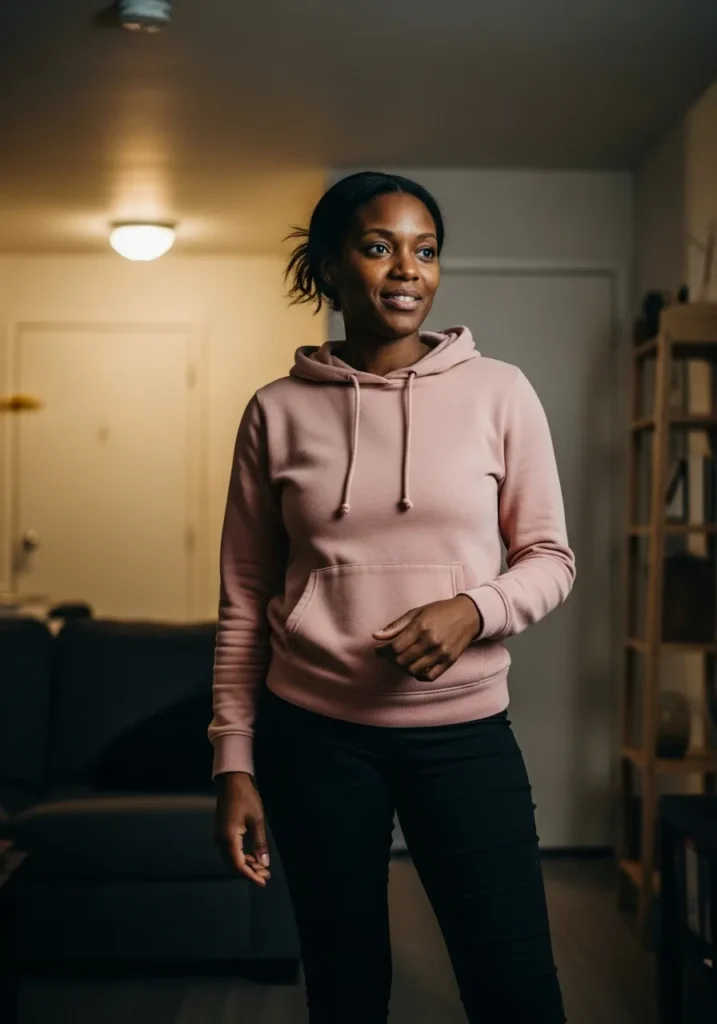 This outfit combines a soft pink hoodie with dark fitted jeans for a cozy and casual look. The hoodie looks warm and comfortable while the jeans add contrast and shape. The overall vibe feels relaxed and easy.