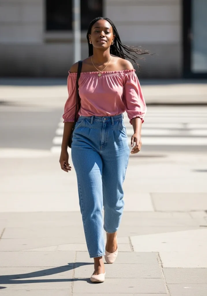 I love off shoulder tops because they add a little charm without feeling overdone. The pink color keeps it sweet and flattering. This is a great everyday outfit when I want to feel cute and confident.