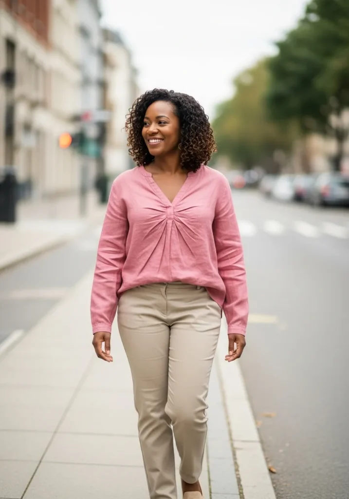 I love looks like this because they feel calm and flattering without trying too hard. The soft pink shade brings warmth to the face and works beautifully for casual days. This is one of those outfits I would wear when I want to feel pretty and comfortable at the same time.