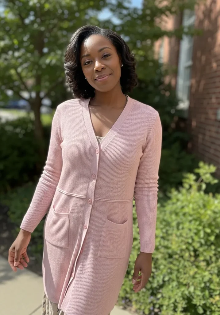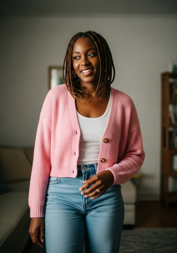 This look pairs a soft pink cardigan with a white top and classic blue jeans for an easy everyday outfit. The cardigan has a cozy knit texture that adds warmth without feeling heavy. The light wash denim keeps everything fresh and casual.