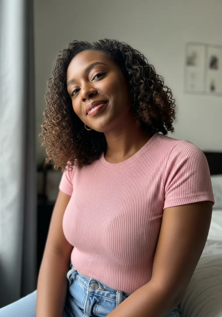 This outfit features a fitted soft pink t shirt paired with classic blue jeans for a clean and relaxed everyday look. The fabric looks smooth and stretchy which keeps it comfortable while still flattering the shape. The overall vibe feels simple modern and easy to wear.