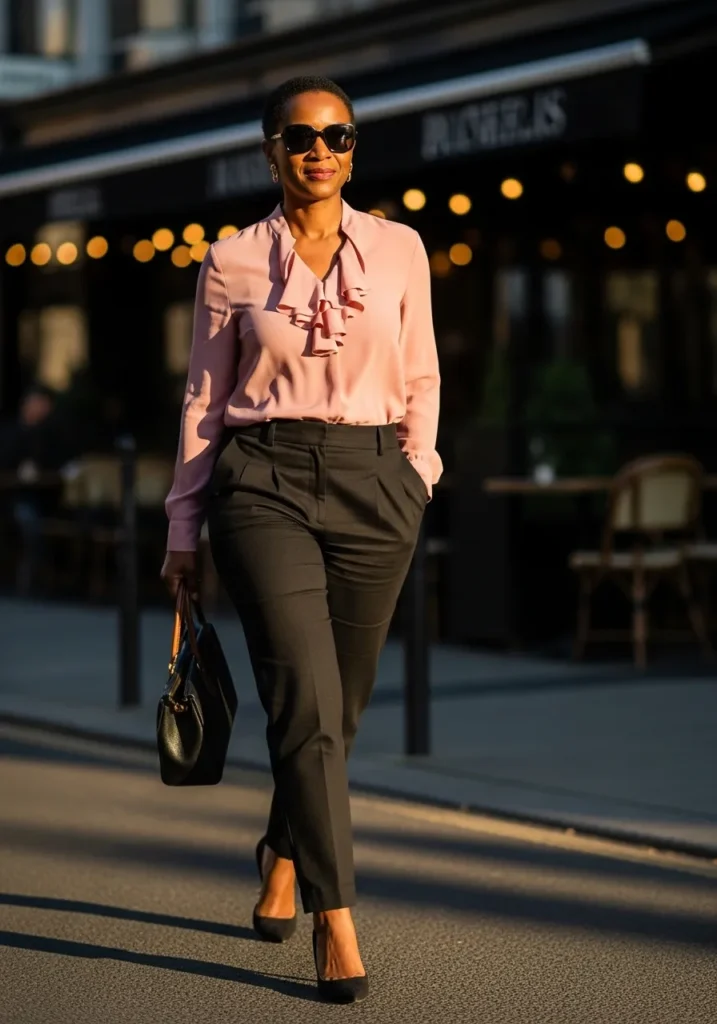 This look pairs a silky pink blouse with high waisted black trousers for a polished and confident outfit. The blouse has a slightly flowy feel that softens the structured pants. Accessories keep the look elevated but still wearable for daytime.