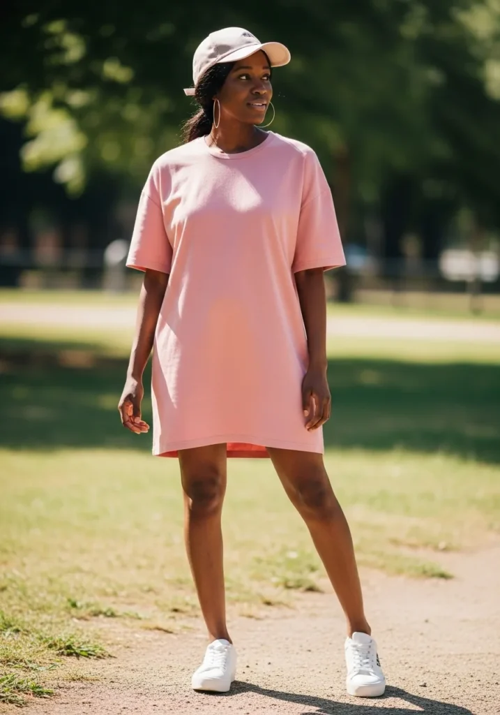 This outfit features an oversized pink t shirt dress styled with white sneakers and a casual cap. The fabric looks soft and breathable which makes it perfect for warm days. The fit feels effortless and sporty with a laid back vibe.