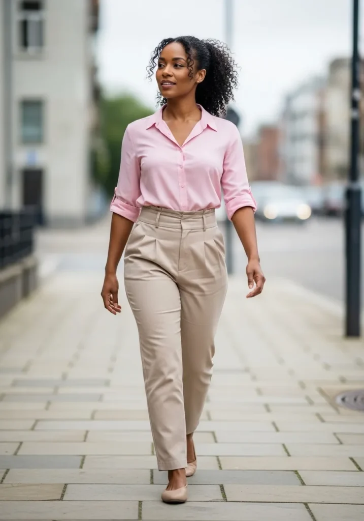 Here we have a light pink button up shirt styled with tailored beige trousers for a clean and refined look. The crisp fabric of the shirt balances nicely with the structured pants, creating a smart but relaxed silhouette. Neutral heels finish the outfit with a simple and elegant touch.