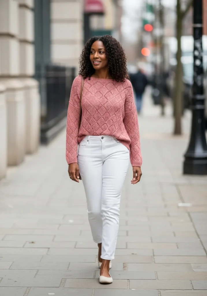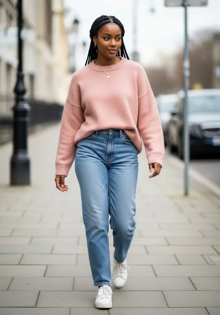 This look features a cozy pink knit sweater paired with light wash jeans for a soft everyday outfit. The sweater looks warm and comfortable while the denim keeps it casual. The overall feel is relaxed and approachable.