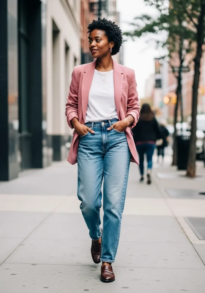 This outfit features a pink blazer layered over a simple top and paired with relaxed fit jeans. The blazer adds structure while the denim keeps the look grounded and wearable. Neutral shoes complete the outfit without stealing focus.