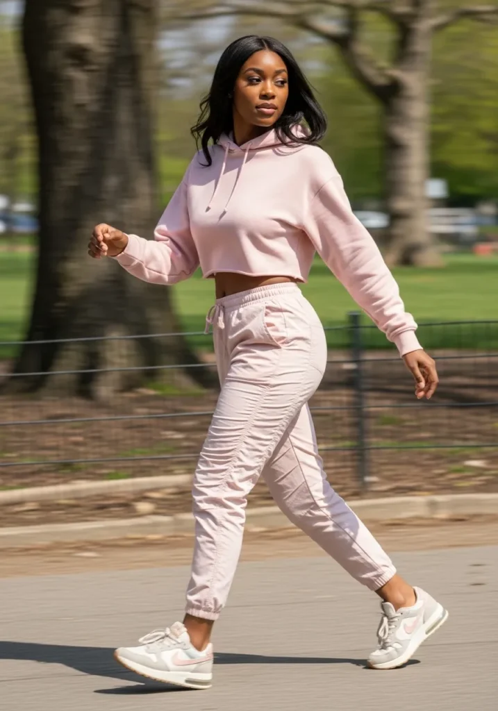This outfit includes a soft pink hoodie paired with matching joggers for a sporty and relaxed feel. The fabric looks cozy and flexible which makes it perfect for movement and comfort. Clean sneakers finish the look with a practical edge.