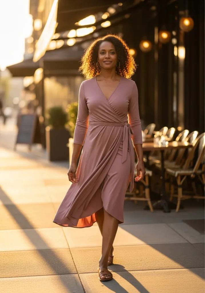 This look features a flowy pink wrap dress with soft pleats and a flattering waist tie. The fabric drapes beautifully and catches the light as it moves. Simple heels keep the outfit elegant but still relaxed.