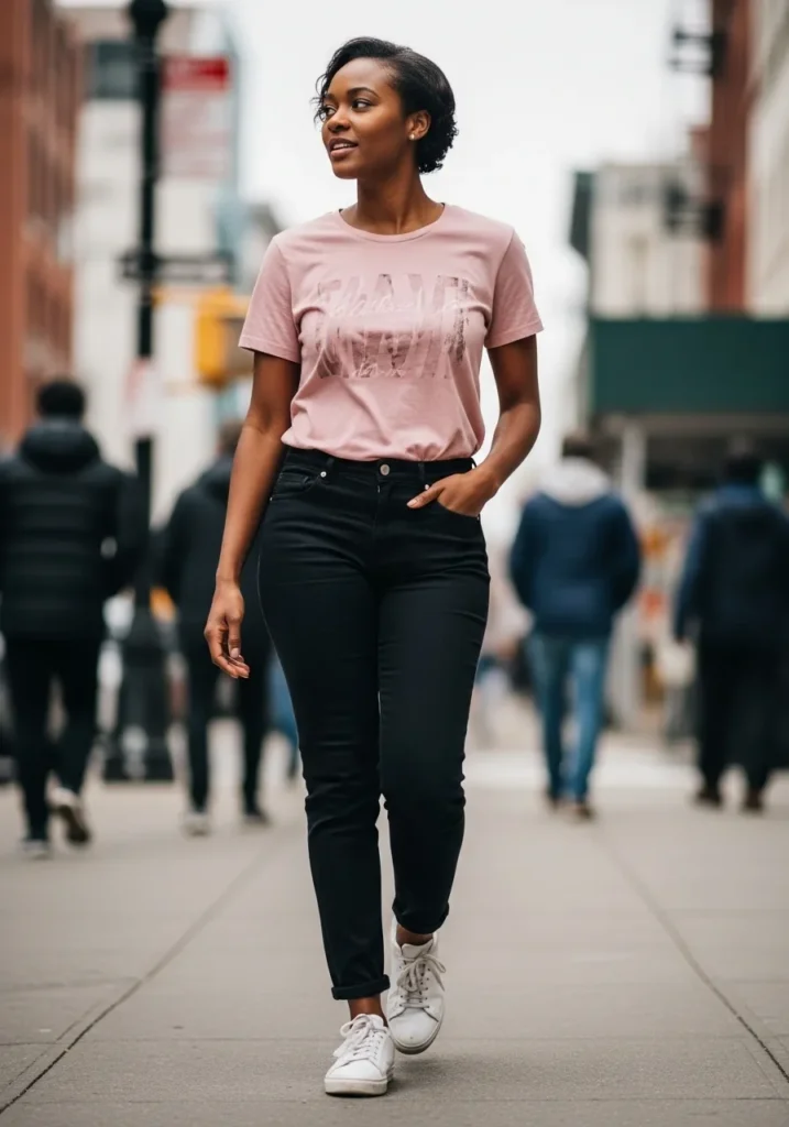 This outfit pairs a light pink t shirt with fitted black jeans for a clean and casual look. The soft cotton tee keeps things comfortable while the dark denim adds contrast and structure. Sneakers make the outfit practical and easy.
