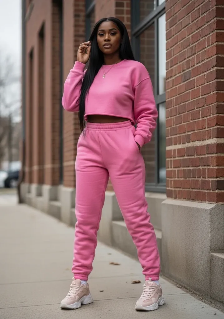 This outfit features a pink cropped sweatshirt paired with matching high waisted joggers and sneakers. The fabric looks soft and flexible, giving the whole look a sporty and relaxed feel. The monochrome pink keeps it bold while still feeling easy to wear.