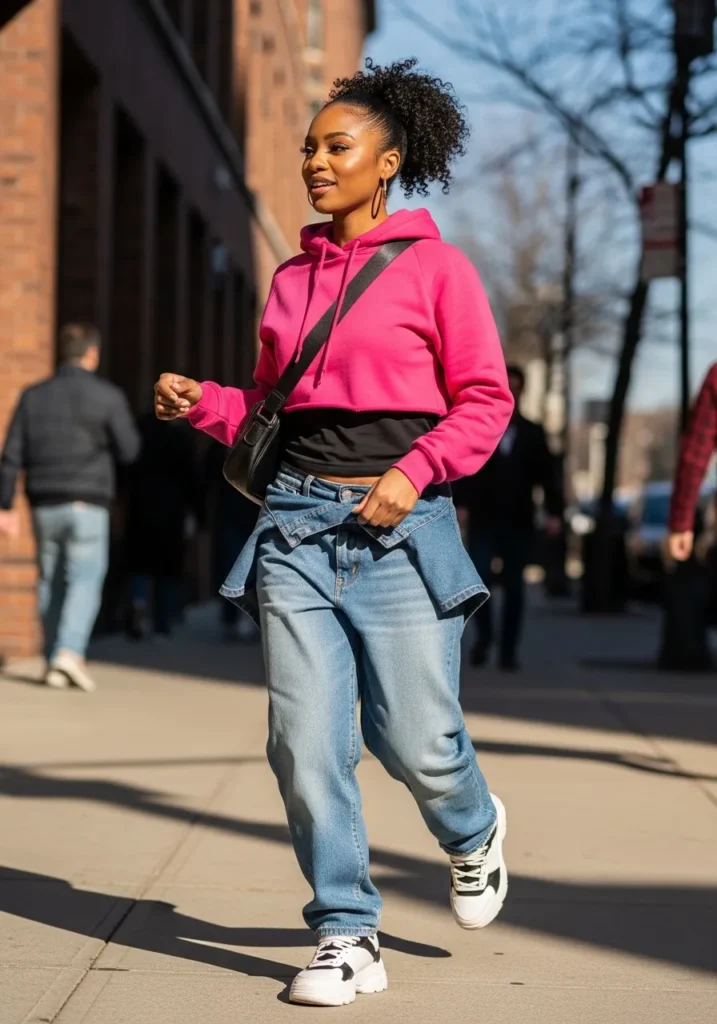 This look pairs a bright pink hoodie with relaxed fit blue jeans and sneakers. The hoodie brings bold color while the denim keeps the outfit casual and wearable. The overall vibe feels sporty, playful, and street ready.