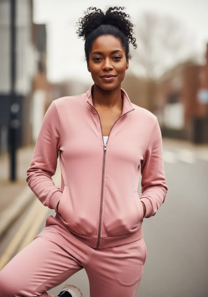 This outfit features a matching pink zip up jacket and jogger pants set. The fabric looks soft and stretchy, perfect for movement and comfort. The monochrome look feels clean, modern, and very on trend.