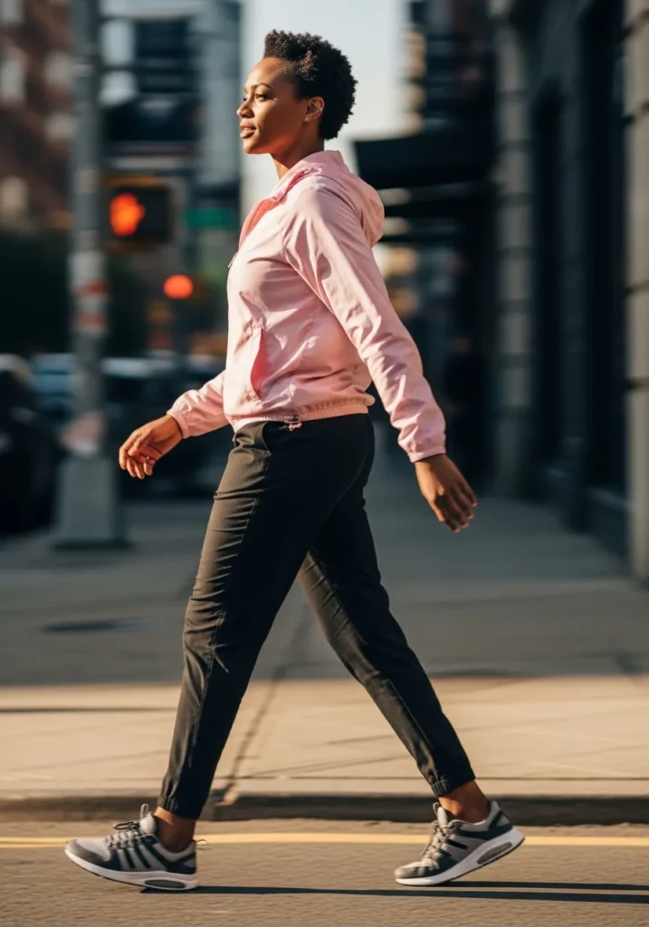 This look pairs a light pink jacket with black joggers and running sneakers. The jacket adds softness while the darker bottoms keep it balanced and street smart. The overall feel is sporty and practical.