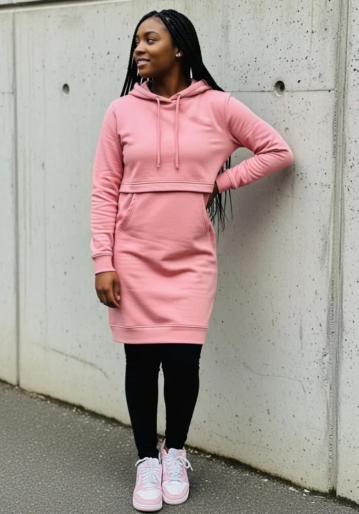 This outfit features a pink hoodie dress styled with leggings and sneakers. The fabric looks cozy and relaxed, perfect for casual days. The hoodie silhouette keeps it sporty and playful.