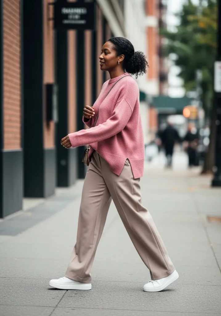 This look pairs a soft pink sweater with relaxed wide leg pants and sneakers. The fabrics feel comfortable and breathable, giving the outfit an easy flow. The color palette feels calm and modern.