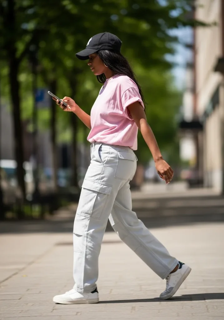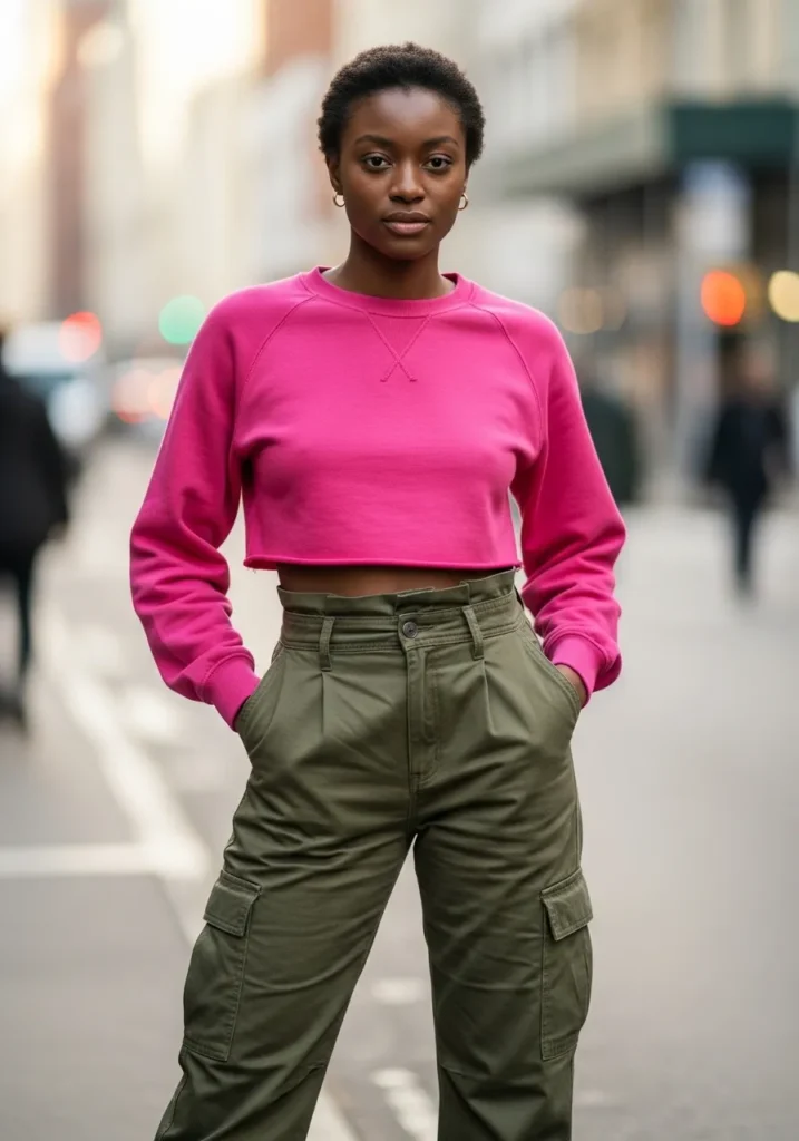 I love this color combo because it feels unexpected but works so well. The pink stands out and the cargos keep it grounded. It is one of those looks that always gets noticed.