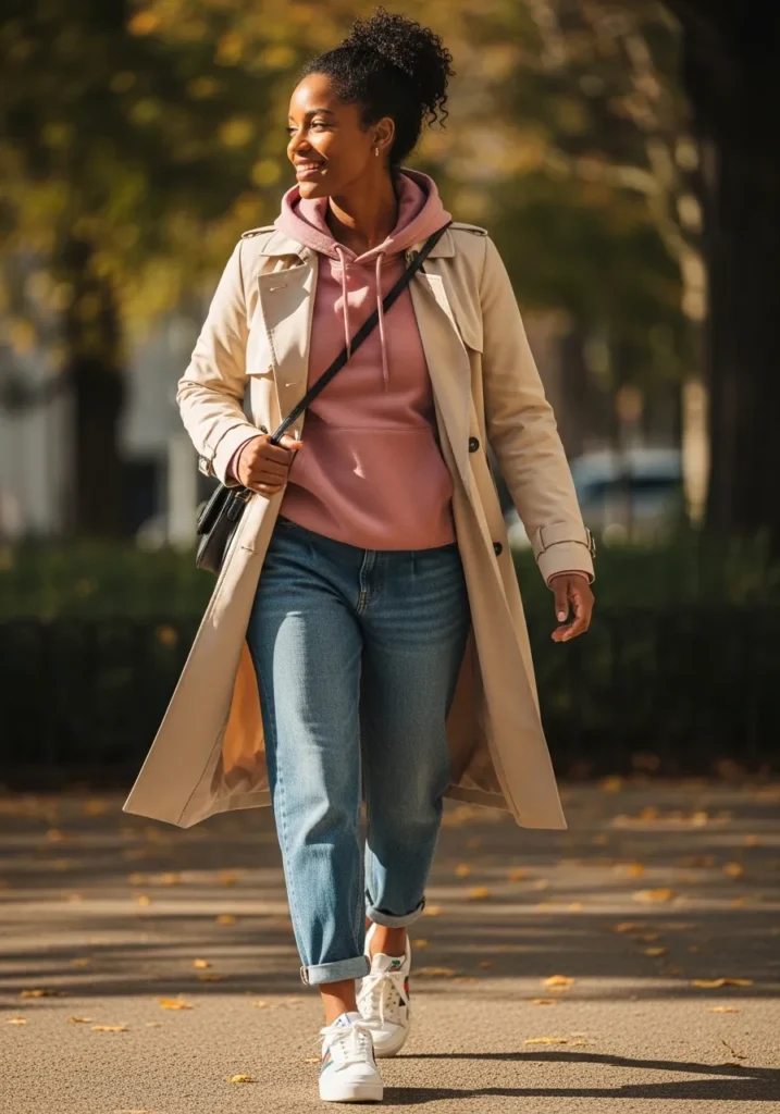 This look pairs a pink hoodie with a long neutral coat, blue jeans, and sneakers. The hoodie keeps it casual while the coat adds structure. The pink peeks through and keeps the outfit playful.
