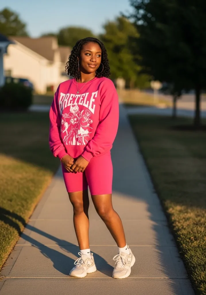 This outfit features a bold pink graphic sweatshirt paired with matching pink biker shorts and chunky sneakers. The sweatshirt feels oversized and cozy while the biker shorts keep the look sporty and balanced. The overall vibe feels playful, confident, and very streetwear coded.
