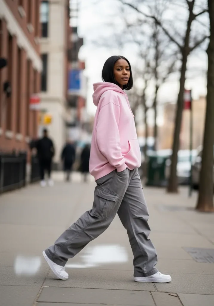 This look pairs a soft pink hoodie with relaxed baggy gray pants and sneakers. The hoodie adds warmth and softness while the loose pants give it that effortless streetwear silhouette. The color contrast feels calm but still stylish.