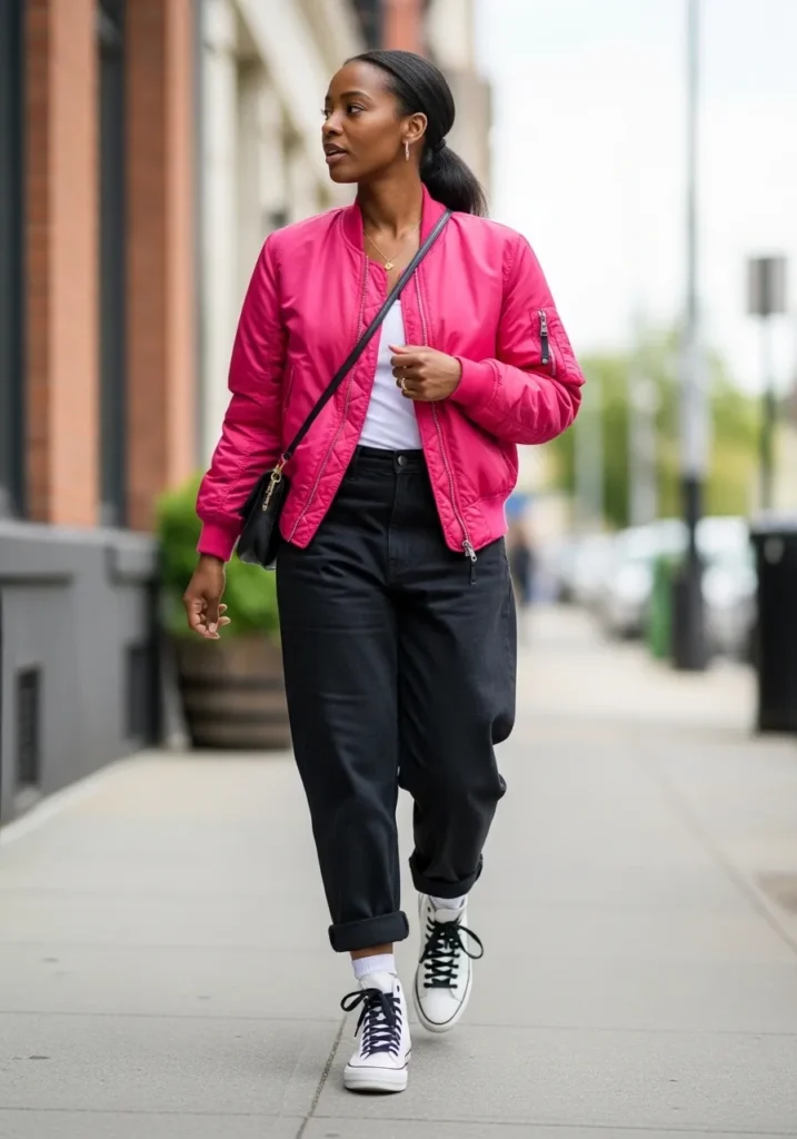 This look pairs a bright pink bomber jacket with a white tee and black joggers for contrast. The jacket adds color and attitude while the joggers keep the outfit grounded. Sneakers finish the look with a classic streetwear touch.