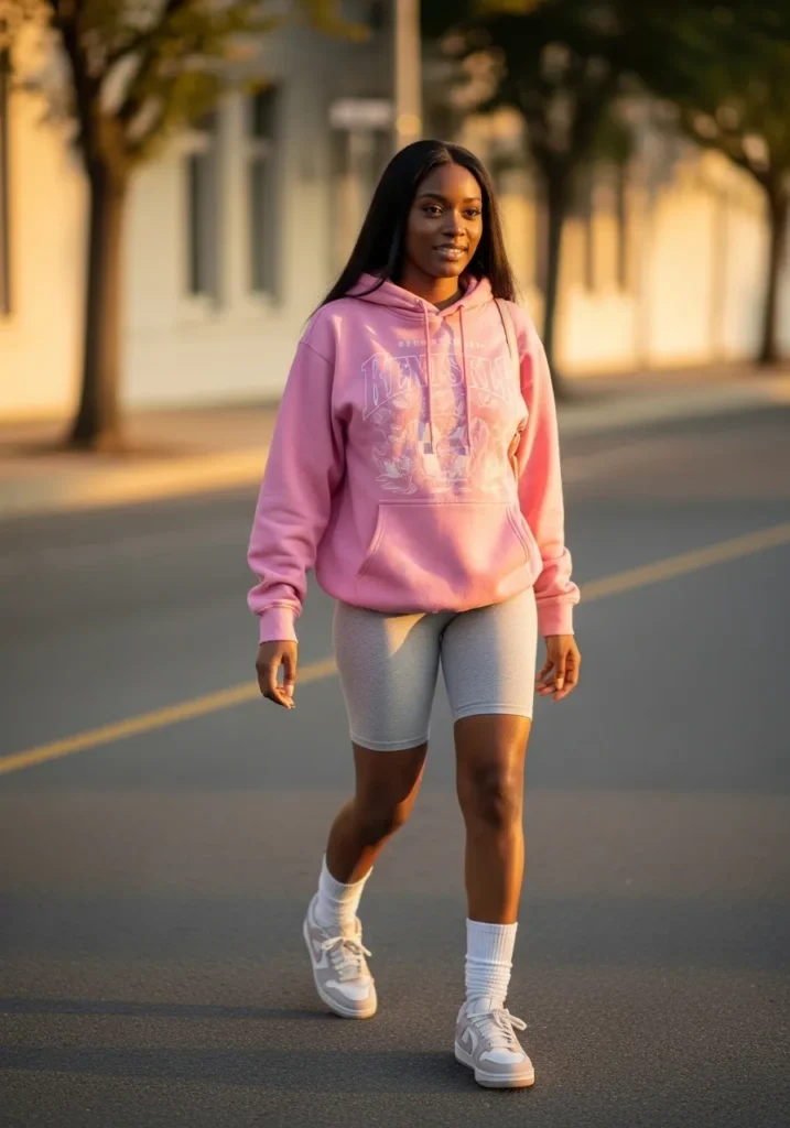 This outfit features an oversized pink hoodie styled with matching bike shorts and crew socks. The hoodie looks cozy while the shorts keep it lightweight and casual. The overall vibe feels relaxed and very street ready.