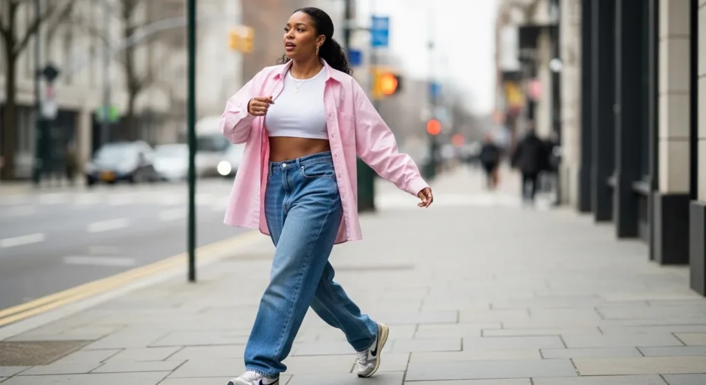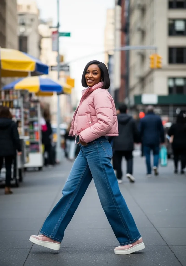 This look pairs a soft pink cardigan with a fitted top and wide leg blue jeans. The cardigan adds warmth while the denim gives it a relaxed streetwear edge. Sneakers keep it casual and wearable.