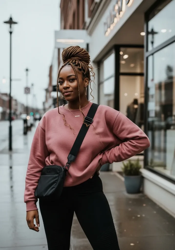 This outfit features a dusty pink sweatshirt styled with black leggings and sneakers. The sweatshirt looks soft and slightly oversized, giving it that cozy street vibe. The black leggings keep everything balanced and clean.