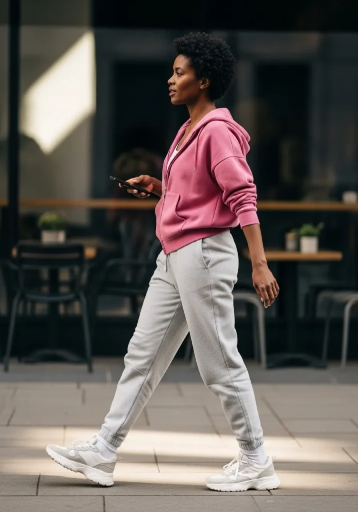 This look pairs a pink hoodie with light gray joggers and sneakers. The soft colors keep the outfit calm while still feeling modern. The fit looks relaxed and movement friendly.