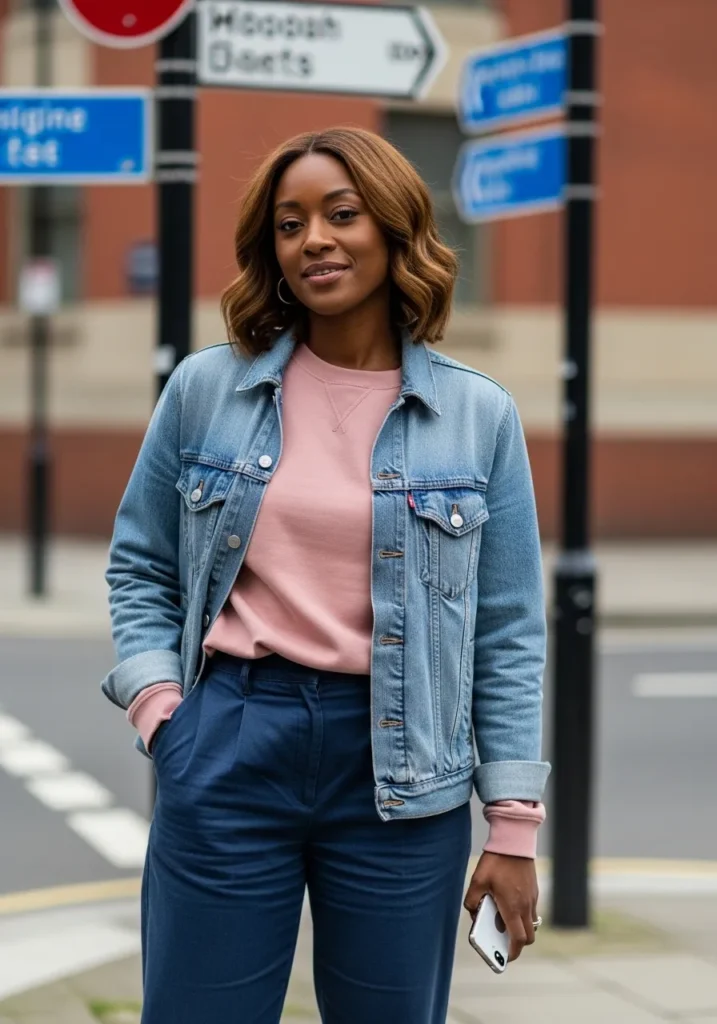 This outfit features a soft pink tee layered under a classic blue denim jacket with dark pants and sneakers. The fabrics feel casual and easy, giving the look that everyday streetwear vibe. The pink adds warmth while the denim keeps it grounded and timeless.