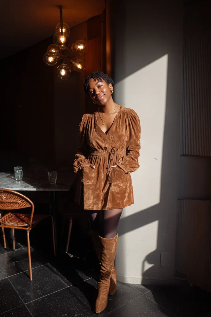 This outfit features a rich brown suede mini dress paired with matching tall boots. The suede texture adds depth and makes the look feel luxe without being flashy. The short hem keeps it fun while the boots balance it out with a sleek finish. The overall vibe is bold confident and dinner ready.