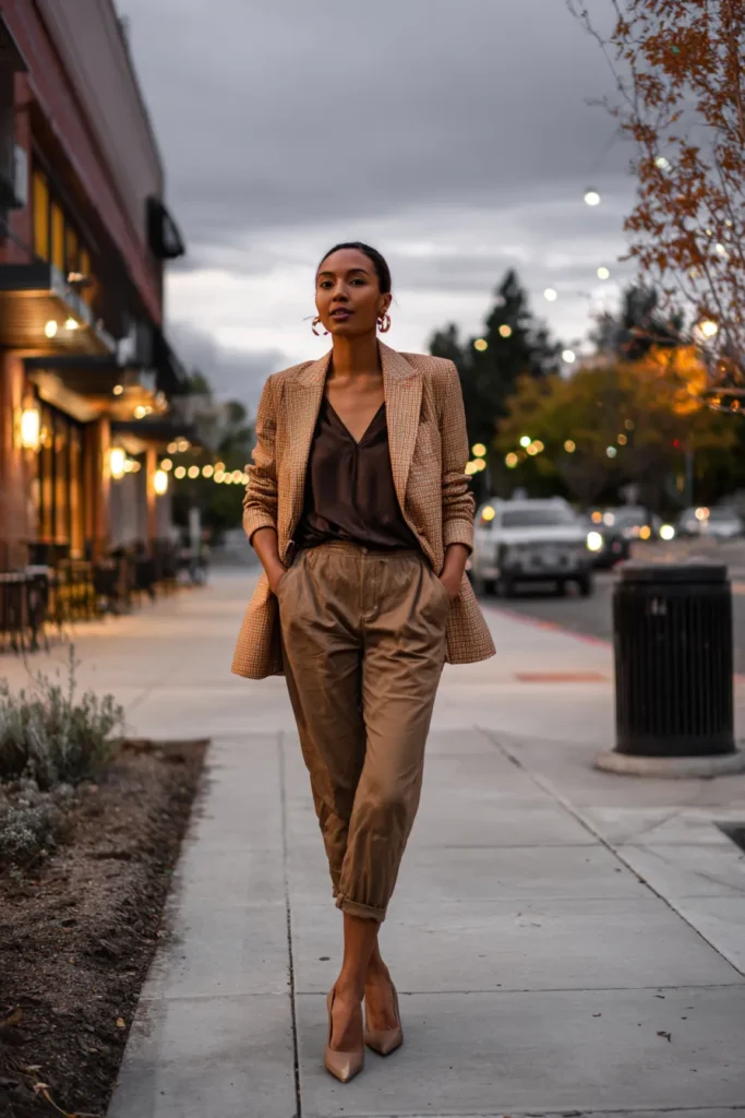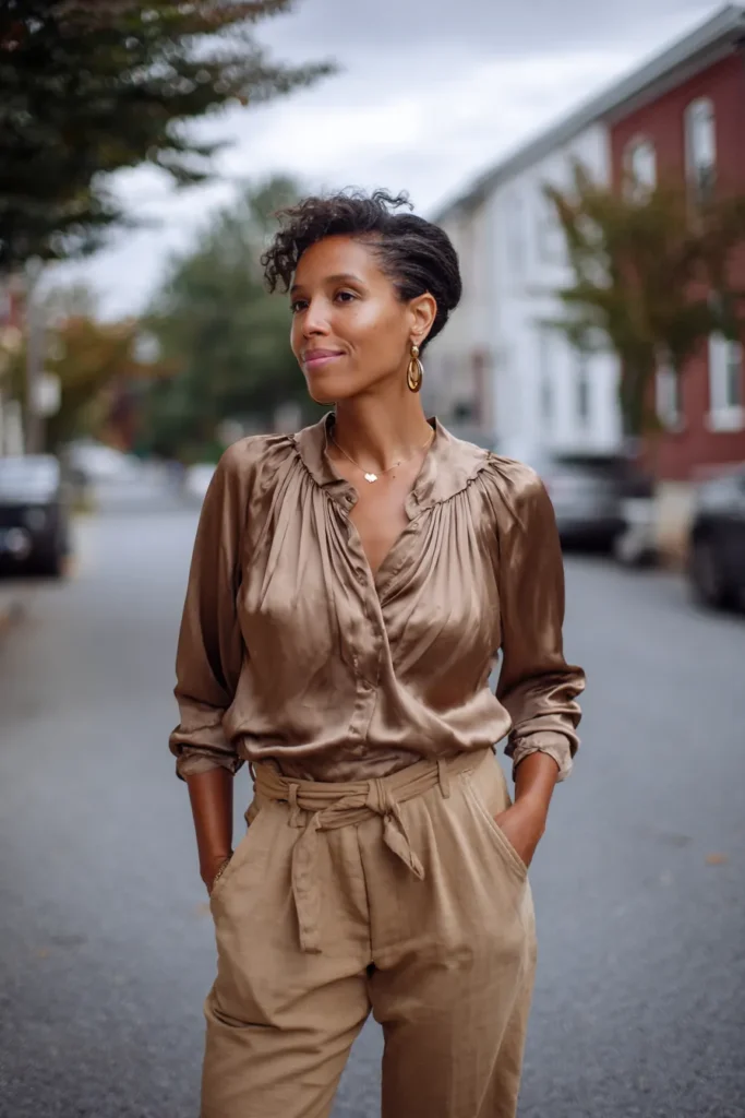 This look pairs a silky brown satin blouse with high waisted tailored trousers in a lighter neutral shade. The soft shine of the top contrasts beautifully with the structured pants. Simple heels and understated accessories keep it elegant and clean. The vibe feels classy modern and very wearable.