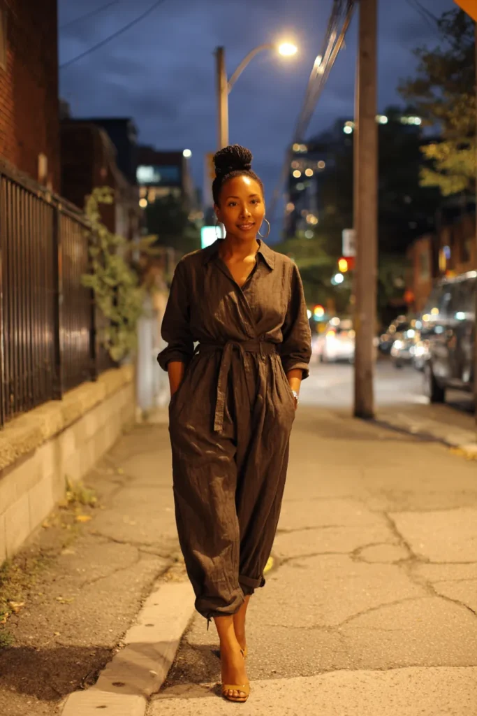 This outfit is all about a deep brown jumpsuit with a belted waist and relaxed fit. The structured shoulders and cinched waist create a flattering silhouette while still feeling easy to wear. Paired with simple heels it instantly becomes dinner appropriate. The vibe is cool confident and modern.
